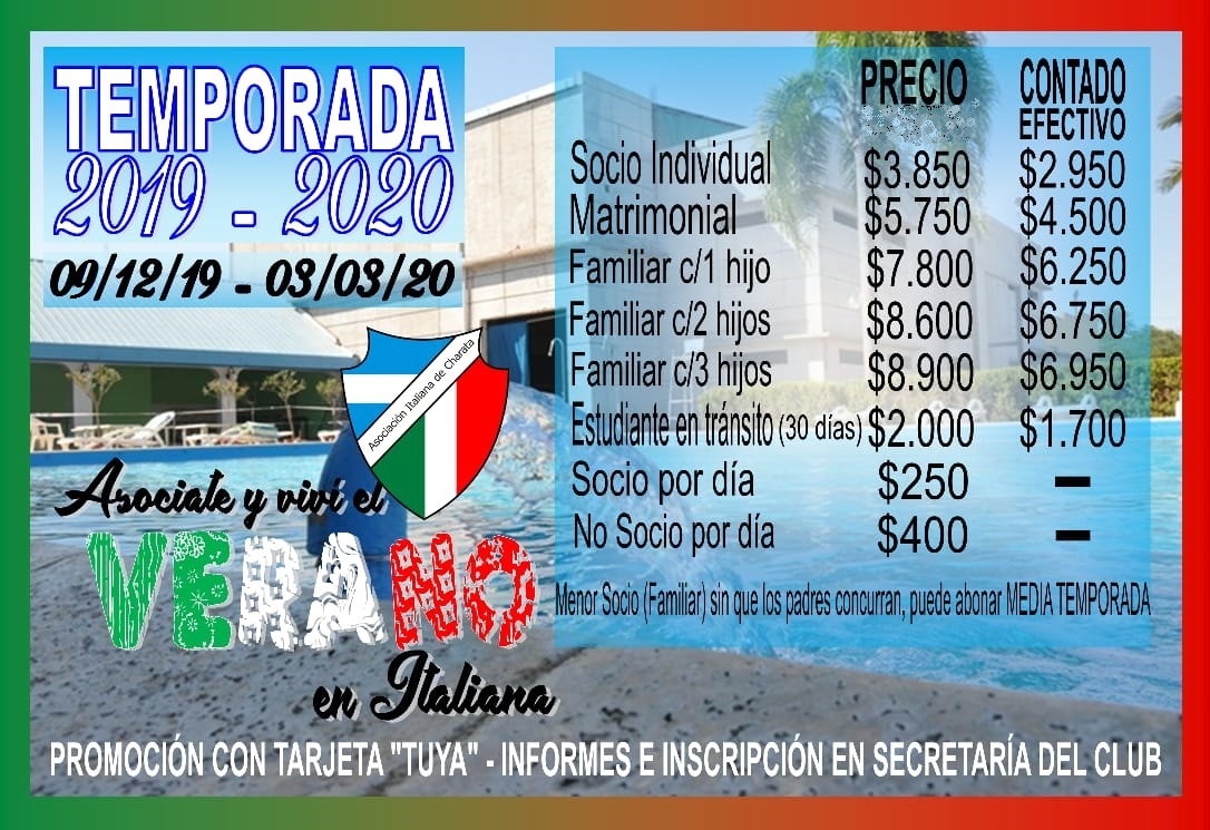 Este lunes 9 de diciembre se realizara la presentación de una nueva temporada de verano en el natatorio de Asociación Italiana. Con precios accesibles para toda la familia y un 20 por ciento de descuento para aquellos socios que abonen en efectivo. Además, se aceptan tarjetas de débito y crédito y con tarjeta Tuya de Banco del Chaco hasta en 6 y 12 cuotas. Serán las vacaciones más económicas, en la mejor ubicación de la ciudad. Habrá kiosco con bebidas heladas y golosinas, confitería con las más esquisitas pizzas y hamburguesas, música, WI-FI, reposeras, juegos, ping pong, cancha de básquet, metegol, y toda la diversión para los chicos. El verano promete ser caluroso y la mejor opción es la pileta de Asociación Italiana. Asociate sin cuota de inscripción. Consultas en Secretaría del club en calle Monseñor de Carlo N°320.