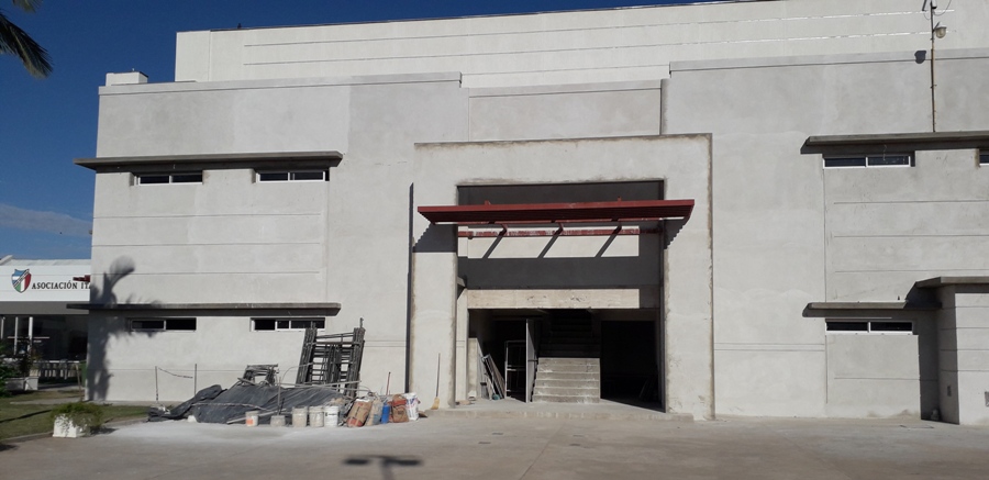 Continúan los trabajos de revoque fino y terminaciones de concreto en la cara frontal y aleros del microestadio. Además se trabaja en la colocación de porcelanato en el sector de terraza superior a sanitarios de salón social. Las obras no terminan acá, se colocaran nuevas luminarias exteriores en aleros, y se realizo la compra de 180 litros de pintura impermeabilizante para el exterior en sector frente y las caras laterales del edificio. Los colores serán similares a los estipulados en los renders del anteproyecto. Ya se evalúan presupuestos para la colocación de piso deportivo, luminarias interiores y cielo raso, para la instalación de butacas para tribunas, y el equipamiento deportivo ( relojes, tableros y jirafas móviles). El sueño del microestadio es una realidad, ahora hay que dejarlo coqueto.