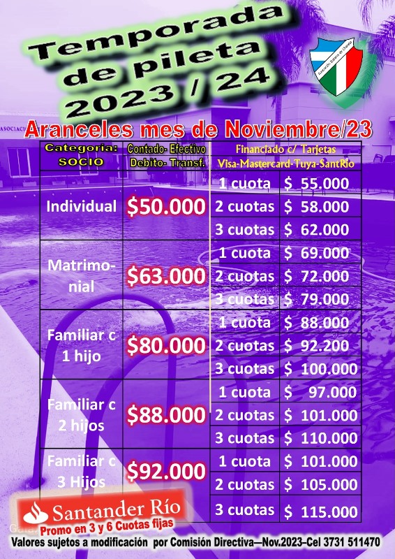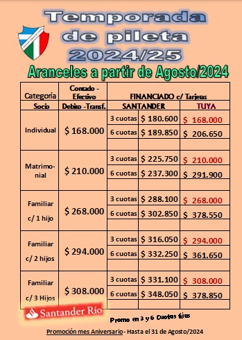 Arrancó la venta de carnets de temporada 2024/2025 de pileta. Asociate y aprovechá las distintas promociones de 3 y 6 cuotas sin interés con tarjetas de Banco Santander los días Jueves y sábado de Agosto. Valores promoción aniversario válidos hasta le 31 de Agosto. Inicio de temporada Noviembre 2024. Consultas en secretaría del club.