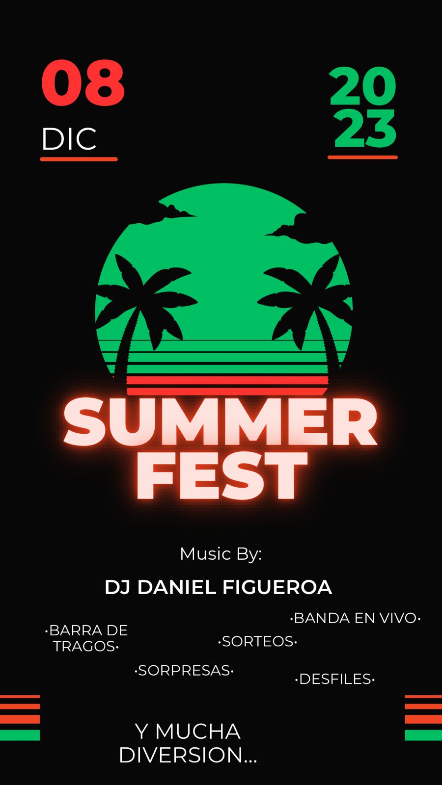 Desfile de modas, show musicales, bebidas, tragos, comidas típicas, peloteros para niños, sorteos, Dj Daniel Figueroa en vivo.