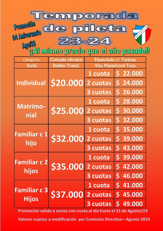 A partir de este Lunes se encuentran a la venta en Secretaría del club, los carnets de temporada de Pileta 2023-2024 al mismo precio que la temporada anterior.