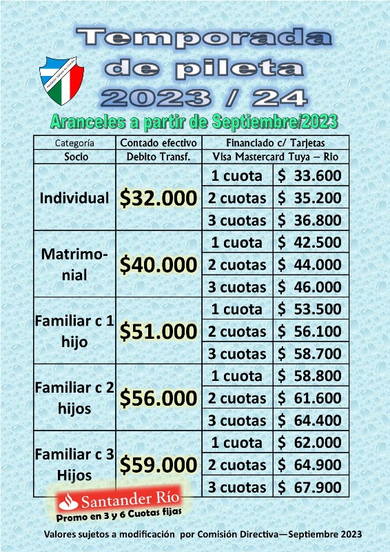 Informamos a los asociados , que con lo recaudado de la venta en pretemporada de carnet de pileta, se han adquirido el total de productos para el mantenimiento del agua ( cloro, alguicida y sulfato de cobre). Pronto comenzaremos con el vaciado y las tareas de pintura en color azul cielo de las paredes y el fondo de la pileta, para luego realizar el llenado de la misma en vistas a la temporada que comenzará en Septiembre. Aún estas a tiempo de obtener tu carnet de temporada. Consulte los precios en secretaría y asóciese sin cuota de inscripción. Consulte la promoción para abonar en cuotas con tarjetas de crédito de Banco Santander.