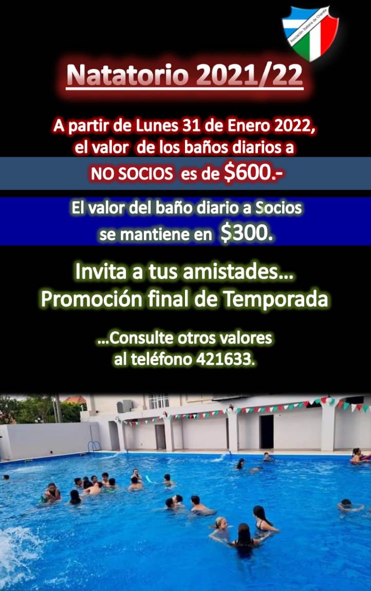 La ola de calor invade el país, y continuará durante una semana en la Perla del Oeste. La mejor manera de combatir las altas temperaturas, es venir a pasar el día en el Natatorio de Asociación Italiana. No te quedes aburrido en casa y venite con tus amigos a la pileta. Te esperamos con Wi Fi, guardavidas, trampolín, sombrillas, reposeras, cantina con bebidas heladas, confitería con las mejores pizzas, mesas de ping pong, básquet y toda la diversión. Consulta precios de temporada en Secretaría del club al 3731 421633. Baños diarios: Socios $300 - No Socios: $900 (Se abonan en Portería).