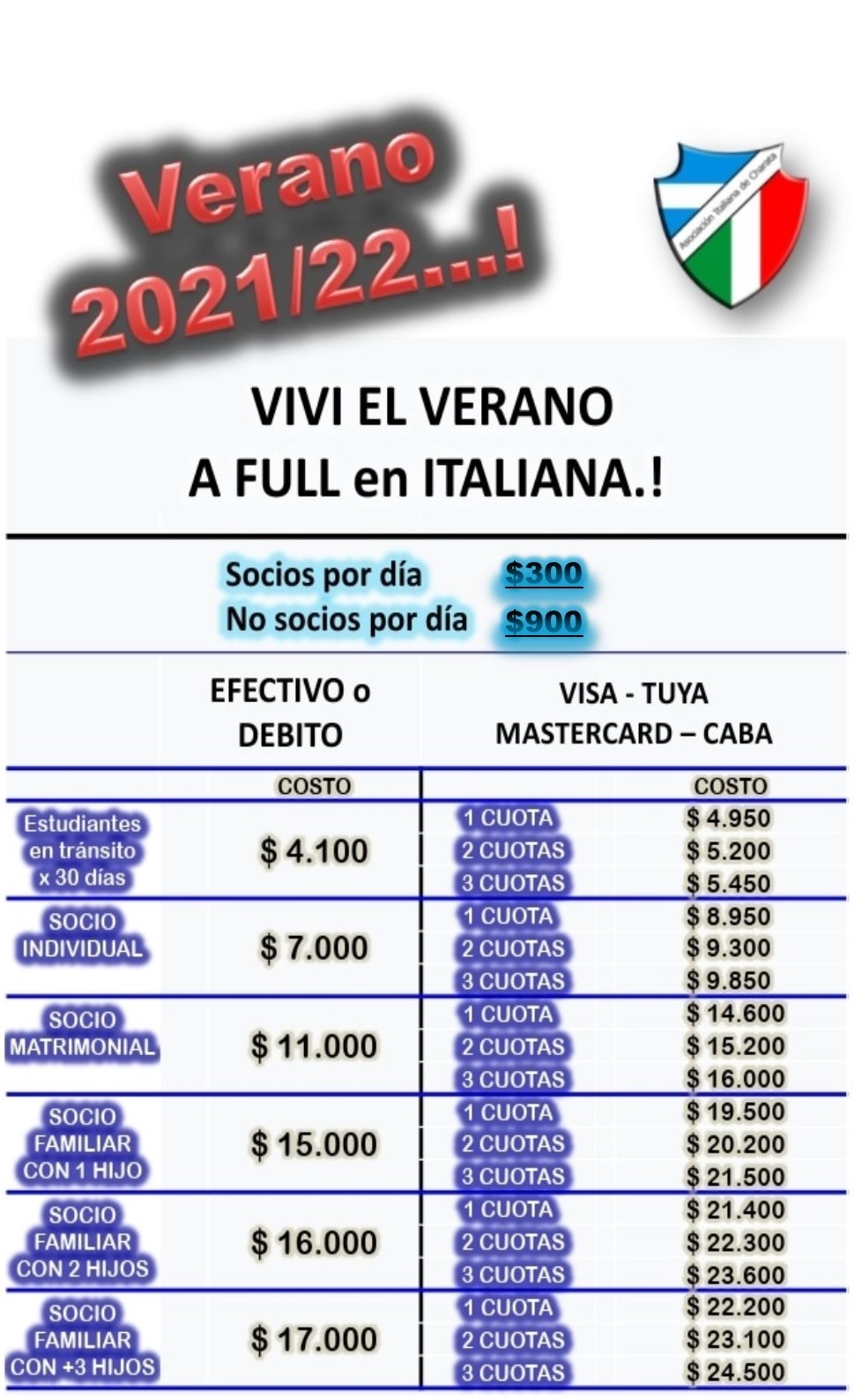 El natatorio de Italiana de espera. Asociate y disfrutá de la temporada de verano a valores económicos en sus distintas categorías ( individual, matrimonial o familiar). Además, aceptamos distintas formas de pago con tarjeta y en cuotas. No te quedes en casa con las dudas y acercate a secretaría o llamanos al 3731 421633. Contamos con wifi, cantina, reposeras, sombrillas, playón deportivo, cámaras de vigilancia y guardavidas en el Natatorio ubicado en el centro de la ciudad de Charata. El verano lo vivís en Italiana.-