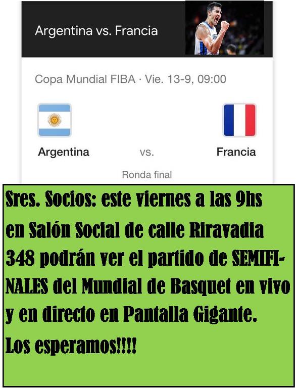 Sres socios este viernes 13 de septiembre a las 9hs en el Salón Social de calle Rivadavia podrán ver el partido de Semifinales del Mundial de Basquet entre Argentina y Francia en Pantalla Gigante. Habra chocolate. Los esperamos!!!