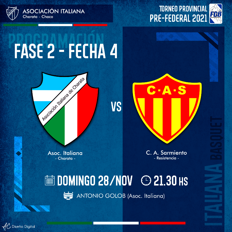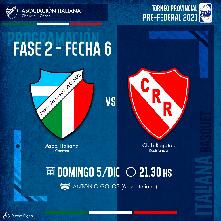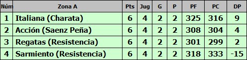 Italiana derrotó a Sarmiento de Resistencia en la 4ta fecha de la 2da Fase del Torneo provincial Pre federal de básquet por 91 a 84. Por su parte, Acción derroto 70 a 66 a Regatas dejando el grupo A igualado  con todos los equipos con 6 puntos, luego de 4 fechas. Por diferencia de gol, Italiana está en la cima, y este fin de semana se cierra con la disputa de la fechas 5 y 6. El tano viajará a Presidencia Roque Sáenz Peña a visitar a Acción, en caso de ganar y que Regatas gane su juego, ya se asegura la clasificación al TOP4 Final. En caso, de que Acción gane, se debe esperar a la 6ta fecha , dónde debe derrotar a Regatas en la Perla del Oeste. Sera un final apasionante. Cada punto cuenta, cada pérdida duele, los equipos se jugaran todo por el todo a llegar a la final.