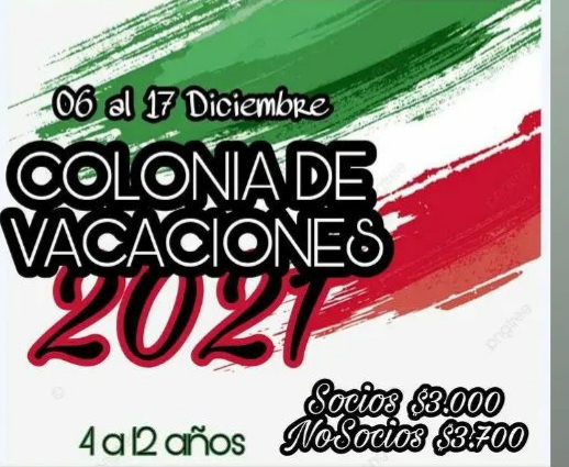 Como todos los años en el mes de Diciembre realizamos la Colonia de vacaciones. Esta temporada inicia el 6 de Diciembre y tendrá continuidad hasta el día 17 , de Lunes a Viernes en horarios de la mañana de 9 a 12hs. Para niños socios y no socios de 4 a 12 años. Habrá actividades acuáticas, deportes y juegos recreativos, manualidades, y juegos en el predio polideportivo. Incluye refrigerio. Organiza subcomisión de minibásquet. Socios $3000. No socios $3700. Descuento a hermanos.-