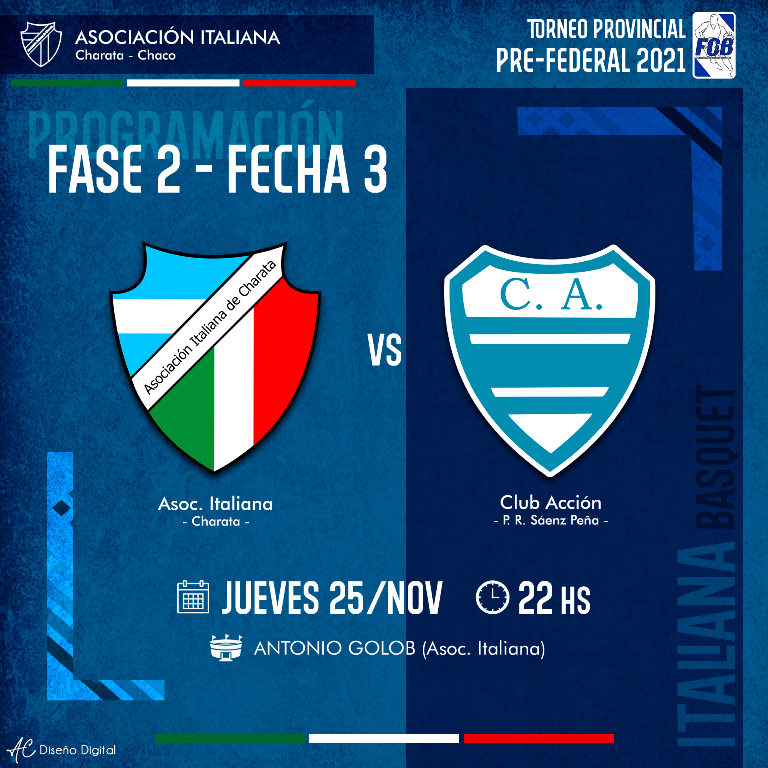 Italiana necesita de tu apoyo para conseguir la primer victoria en la 2 fase del Torneo Provincial Pre Federal de Básquet. Este Jueves 25 de Noviembre a las 22hs, los tanos reciben a Acción de Presidencia Roque Sáenz Peña en el Estadio Antonio Golob con la presión de ganar. Vamos todos a alentar al único equipo Charatense en busca de la clasificación  al Federal. Entrada $200. Habra servicio de cantina. Los esperamos.-