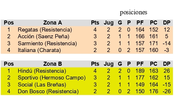 vie 19/nov 21,30 Sarmiento (Rcia) 83 vs. Italiana (Charata) 81; Acuña, Diego Tevez, Lucas Bonnet, Hugo