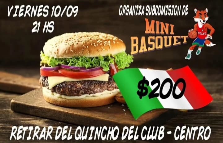Este Viernes 10 de Septiembre, nosotros te preparamos la cena con las más riquisimas hamburguesas completas a solo $200. Pedilas a los jugadores o subcomision de minibasquet. Retirar del quincho del club a partir de las 21hs.