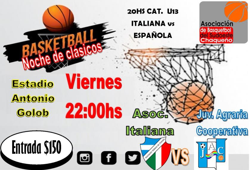 Este Viernes sera una noche de clásicos charatenses. A partir de las 22 hs Italiana recibe a Juventud Agraria Cooperativa por la 6ta jornada del Torneo Asociativo de 1ra División. En la Previa, la categoría U13 recibe a Asociación Española. Entrada $150. Habra servicio de cantina con hamburguesas y bebidas. Los esperamos.