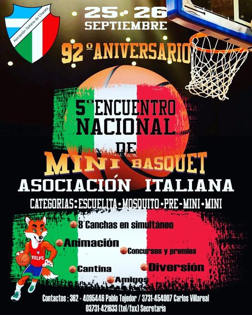 Se viene el 5to Encuentro de Minibpasquet 92° Aniversario de Asociación Italiana. Los días Sábado 25 y Domingo 26 de Septiembre los "peques" competirán en categorías Escuelita, Mosquito, Premini y Mini. Habrá Animación , cantina, Concursos, premios, y toda la diversión con 8 canchas en simultáneo entre los clubes de la Provincia. Te esperamos.