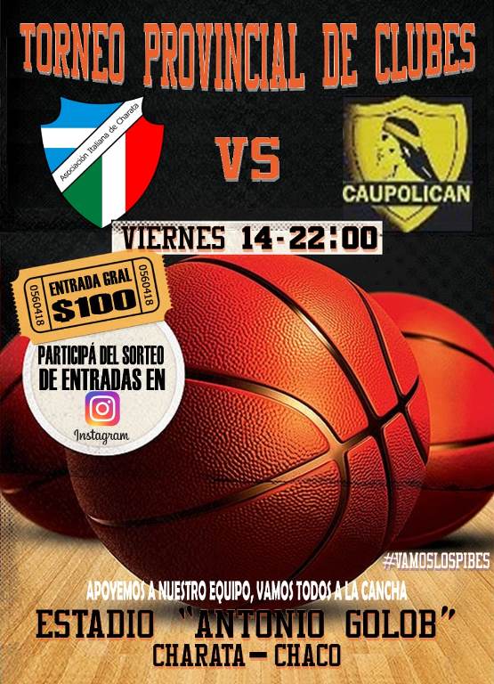 Asociación Italiana recibe por la 13°fecha del Torneo Provincial de Básquet a Caupolicán de Quitilipi  este viernes 14 de febrero a partir de las 22hs en el Estadio Antonio Golob. El tano debe conseguir la victoria para asegurar el 2° puesto del grupo B y evitar así la reclasificación. Serán árbitros del juego, Cesar Oviedo y Franco Mato, Comisionado Técnico Guillermo Duarte. Entrada General $100. Habra servicio de cantina. ¡¡¡Acompañe a los pibes !!!