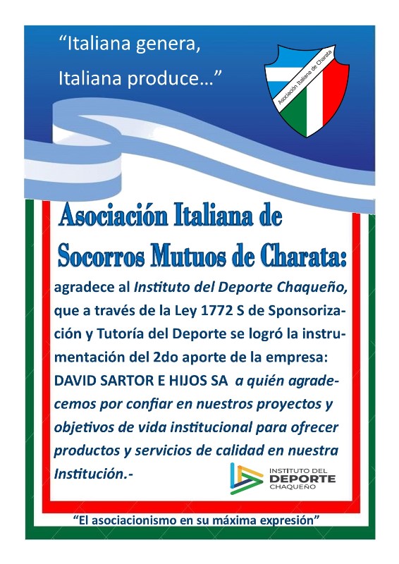 Asociación Italiana de Socorros Mutuos de Charata agradece al Instituto del Deporte Chaqueño, que a través de la Ley 1772 S de Sponsorización y Tutoría del Deporte se logró la instrumentación del segundo aporte de la empresa DAVID SARTOR E HIJOS SA, a quiénes también agradecemos por confiar en nuestros proyectos y objetivos de vida institucional para ofrecer productos y servicios de calidad en nuestra Institución.