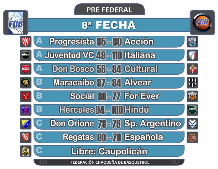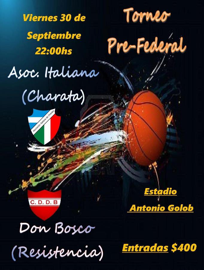 Éste Viernes desde las 22:00 horas en el Estadio Antonio Golob, Asociación Italiana recibe a Don Bosco por la novena fecha del Pre Federal de basquetbol organizado por la Federación Chaqueña, en un duelo clave en el grupo A, donde el que obtenga la victoria quedará tercero en puesto de repechaje a una fecha del final. Los tanos deben ganar por más de 12 puntos para tener ventaja en caso de empate de puntos con el Salesiano. El grupo A lo lidera Cultural con 15 puntos, seguido de Progresista con 14, Don Bosco e Italiana tienen 13 puntos.