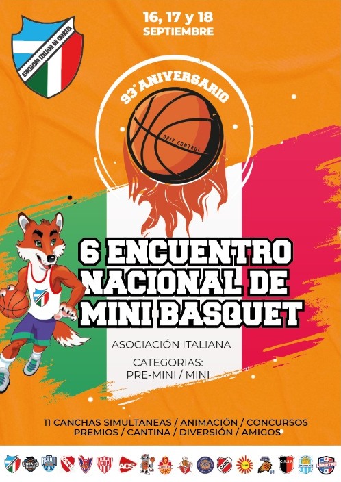 Este fin de semana se realiza el 6to Encuentro de Minibásquet "93 Aniversario" de Asociación Italiana de Charata. Se paraliza la ciudad con la llegada de más de 30 equipos  de categorías Pre Mini y Minibásquet. Habrá 11 canchas simultáneas en Playón, Estadio, y Microestadio de Italiana, más la sub sede en Asociación Española. Habrá juegos, animación, concursos, premios y cantinas. Acto central sabado 19:hs. Los esperamos para vivir la fiesta del básquet.