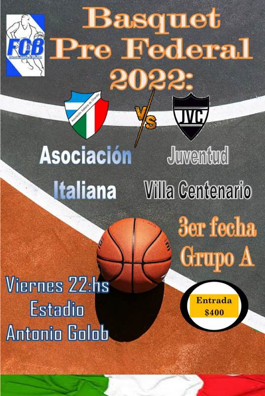 Este Viernes 19 de Agosto en el Estadio Antonio Golob, Asociación Italiana recibe a Juventud de Villa Centenario de Resistencia en busca de su segunda victoria consecutiva en el Torneo Pre Federal de Básquet de mayores de 2022. El partido correspondiente a la 3er fecha del torneo del grupo A iniciará a las 22:00hs y los tanos no podrán contar con Mariano Minhot por un golpe en el tobillo. Entrada General $400, niños gratis. Servicio de cantina con choripanes, hamburguesas y gaseosas.