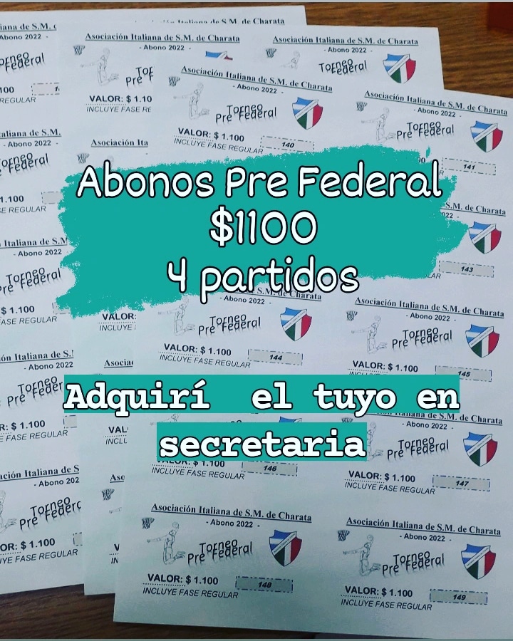 A pedido de los simpatizantes, seguimos con la venta de abonos para el Torneo Pre Federal para ver a Asociación Italiana en los 4 partidos que restan de la fase regular. El Valor es de $1100. Recordamos que la entrada general es de $400 y fue acordado en reunión de la Federación y los clubes. Si lo adquirís, te ahorras $500. Espectacular promoción. No te la pierdas. Podes adquirirlos en secretaria hasta la jornada del partido.
