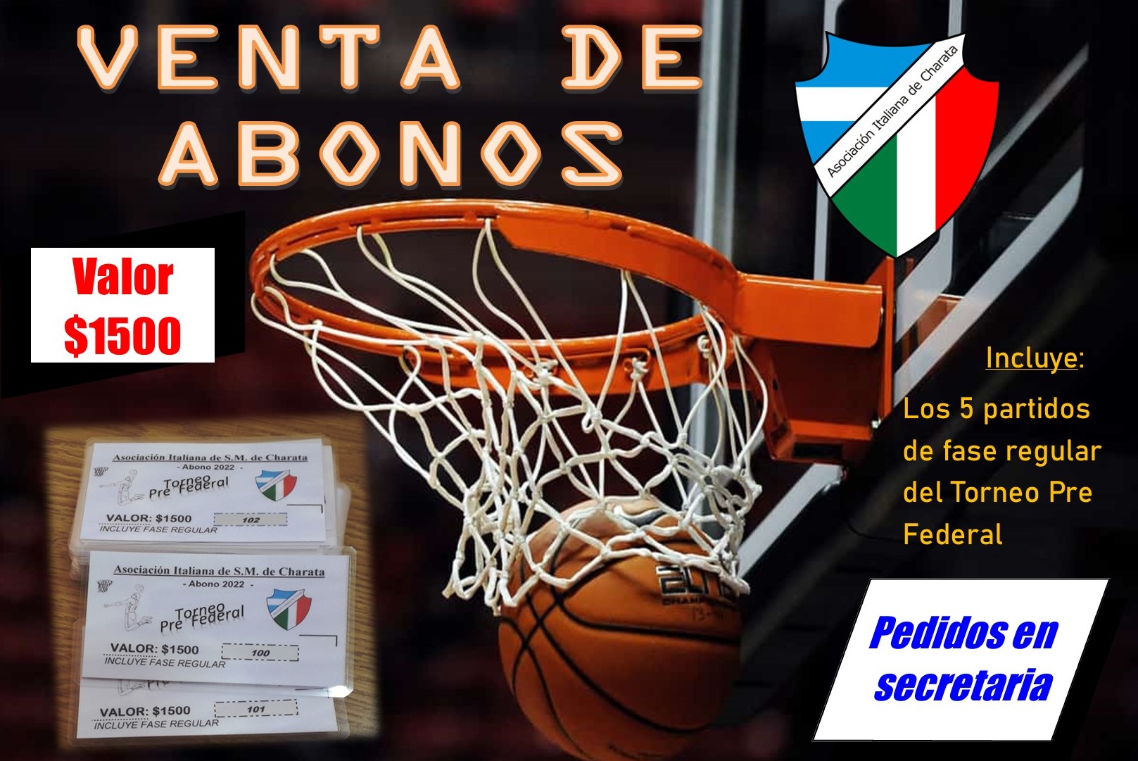 Ya se palpita el inicio del Pre Federal y Asociación Italiana lanza a la venta el abono para los 5 partidos de local de la primera fase a solo $1500,00. (Promedio de $300,00 por juego). Cabe destacar que la entrada general estará $400,00 por cada juego, lo que hace un ahorro de $500 en la compra de tu abono. Si sos socio y te gusta el básquet, no podes faltar para alentar al tano. Aprovecha esta imperdible promoción y ganale a la inflación. Soliciten su abono en la secretaría del club. Los esperamos.-