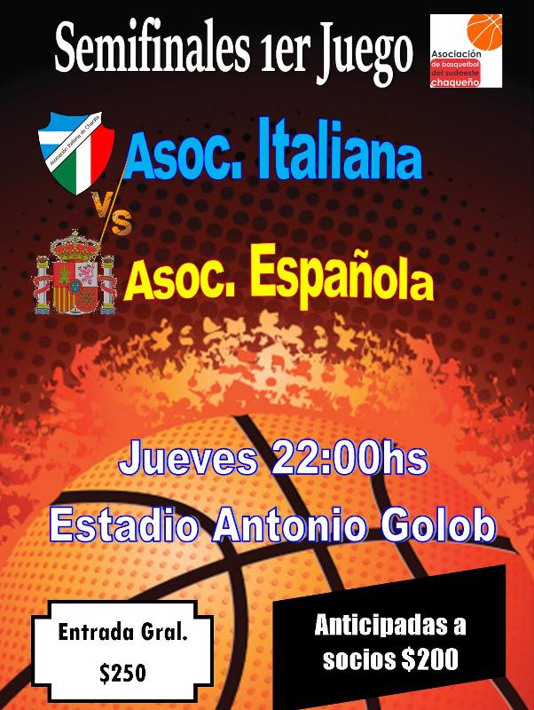 Este Jueves desde las 22:00hs en el Estadio Antonio Golob se paraliza la ciudad en el primer juego de la serie de semifinales del Torneo Asociativo categoría Mayores entre Asociación Italiana y Asociación Española. Los tanos ganaron los 2 clásicos en fase regular pero el prado quiere revancha. Una noche a puro básquet. Vamos todos a alentar al tano. Entrada General $250. Anticipadas a socios en secretaría del club: $200. Servicio de cantina con bebidas y choripanes.
