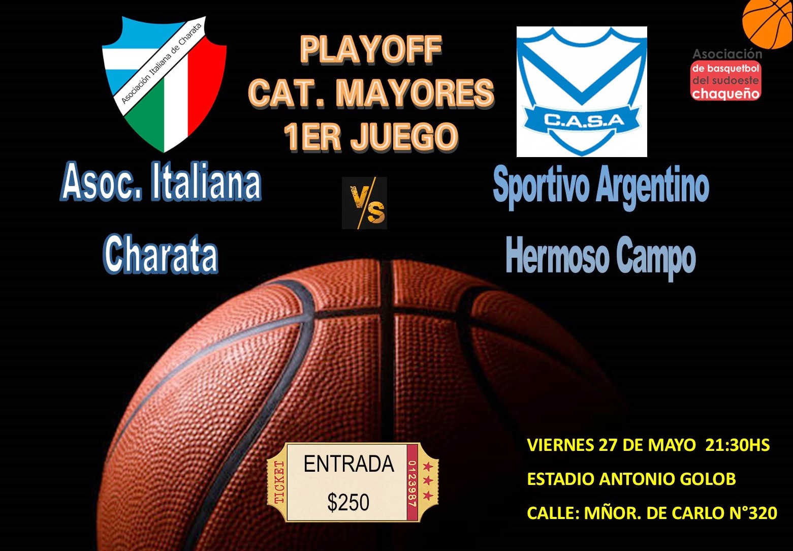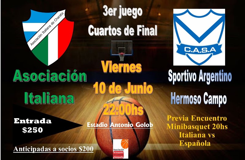 Este Viernes 10 de Junio a partir de las 22:00hs, en el estadio Antonio Golob se juega el 3er partido definitorio de la serie de Cuartos de Final de torneo Asociativo de mayores entre Asociación Italiana y Sportivo Argentino de Hermoso Campo. A todo o nada, el que gana continúa en semifinales, mientras espera Asociación Española al ganador. Partidazo que no te podés perder. Entrada General $250. Anticipadas en secretaría a socios $200. Habrá servicio de cantina con los choripanes más ricos, hamburguesas y bebidas.
