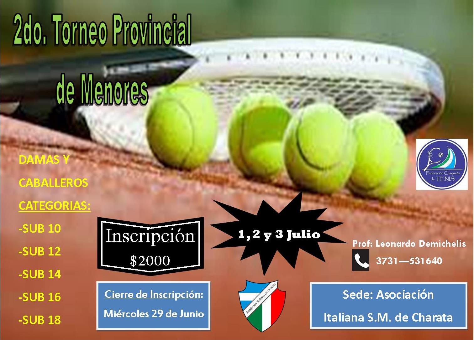 Se viene el 2do Torneo Provincial de Tenis de Menores, en las 4 canchas del polideportivo del Barrio Ülm. En fin de semana de l 1, 2 y 3 de Julio será el momento de los chicos en categorías sub 10 hasta sub18 en damas y caballeros. Inscripciones e informes: Profesor Leonardo Demichelis 3731-531640. Los esperamos.-