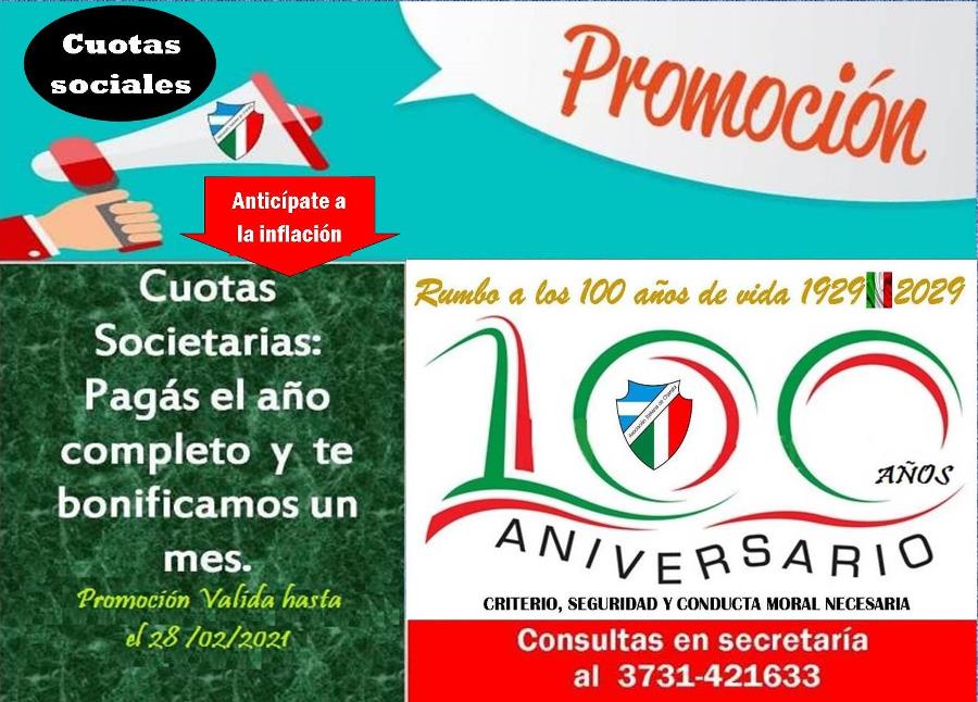 Buscando oxigenar el bolsillo de sus asociados, Asociación Italiana de Charata inició el año con otra gran promoción en el pago de cuota social: si se realiza el pago adelantado de las 12 cuotas, la institución les bonificará 1 mes, es decir que pagarán solo 11 cuotas. La promoción estará vigente durante Enero y Febrero, oportunidad en que los socios, en cualquiera de sus categorías: podrán abonar las cuotas societarias de todo 2021 y tendrán como bonificación un mes, además de cubrirse ante los posibles aumentos que durante el año calendario pueden surgir. Fue una decisión de la Comisión Directiva para que la familia Tana tenga un beneficio más, y con ello pueda lograr un ahorro en un año donde se avizora un panorama complicado desde lo económico. El objetivo es que el costo de las cuotas, las cuáles tienen un valor accesible, no sean un escollo para que el asociado continúe viniendo a practicar su deporte favorito, o simplemente disfrutar del Club que se encuentra en impecables condiciones y se proyectan nuevas obras y actividades hacia el centenario. Lo importante es que la promoción, que estará vigente hasta el 28 de Febrero abarcará todas las formas de pago estipuladas: contado efectivo, tarjetas de débito, Home Banking, cheque y tarjetas Red Tv o de créditos. Consultas en secretaría del club al 421633.