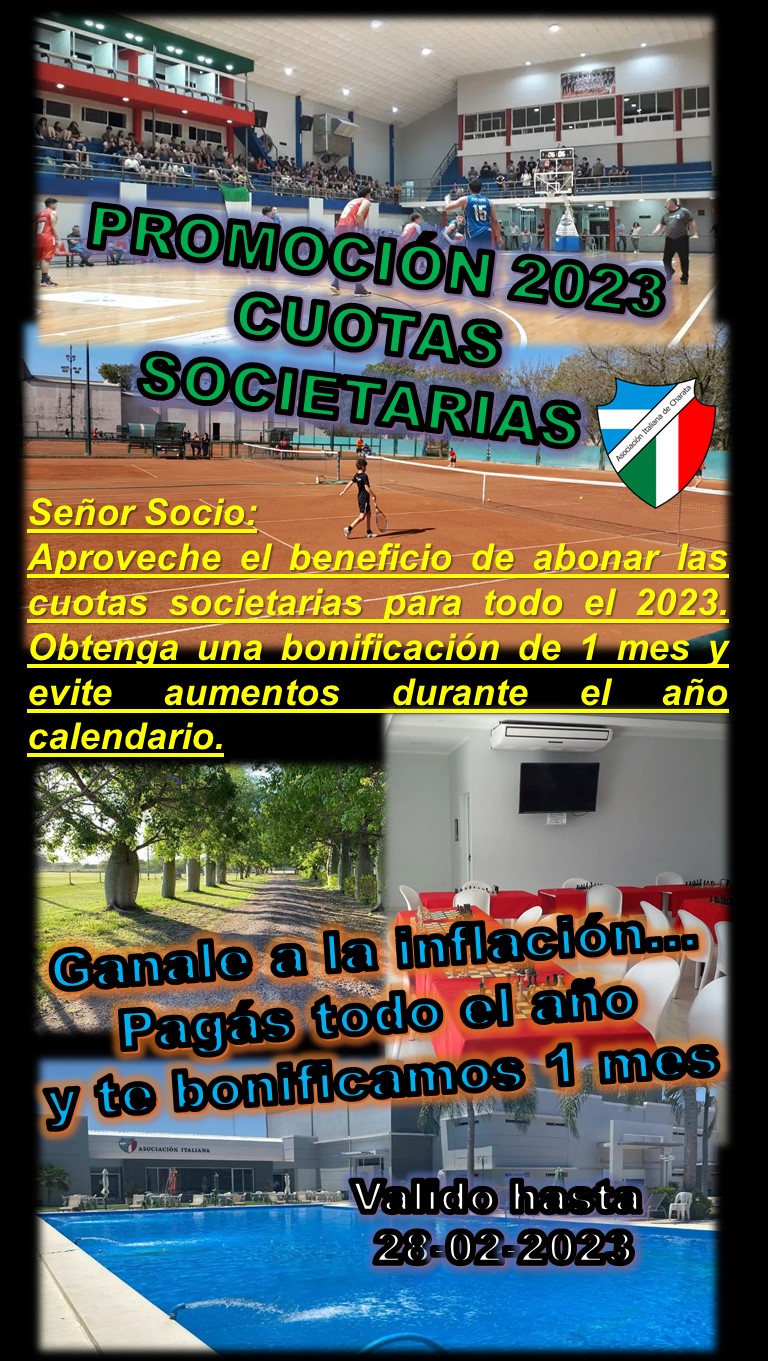 Informamos a los asociados que esta vigente hasta el 28 de febrero del 2023, la promoción del pago anual de la cuota societaria con la bonificación de 1 cuota societaria. Aproveche esta oportunidad de obtener este beneficio y ganar ante los incrementos que se producen por la inflación. Consultas en secretaria del club al 3731 421633.-