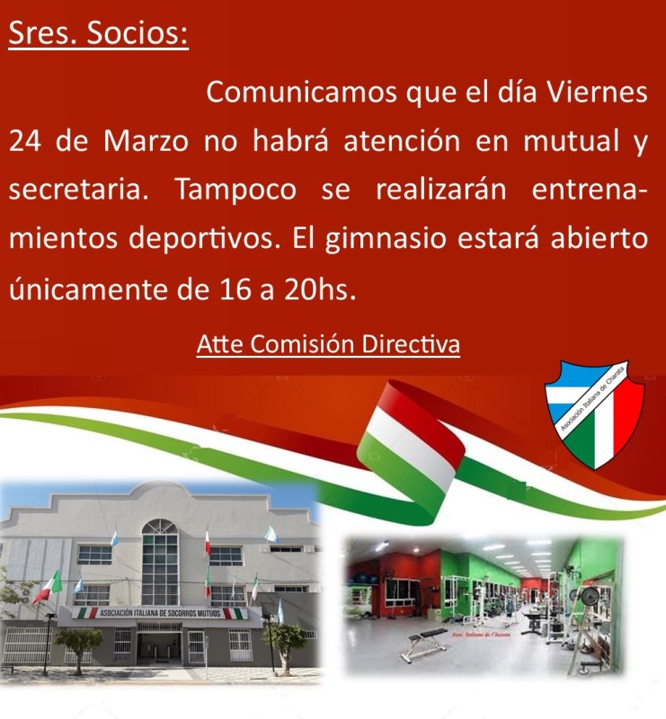 Comunicamos que el día Viernes 24 de Marzo no habrá atención en mutual y secretaria. Tampoco se realizaran entrenamientos deportivos. El gimnasio estará abierto unicamente de 16 a 20hs.