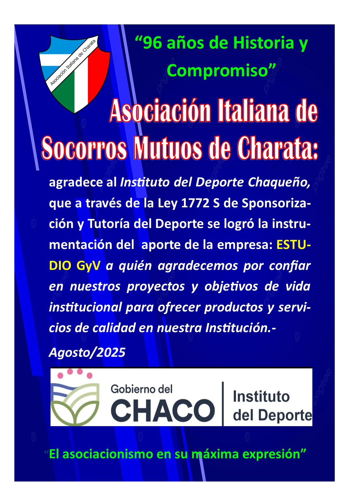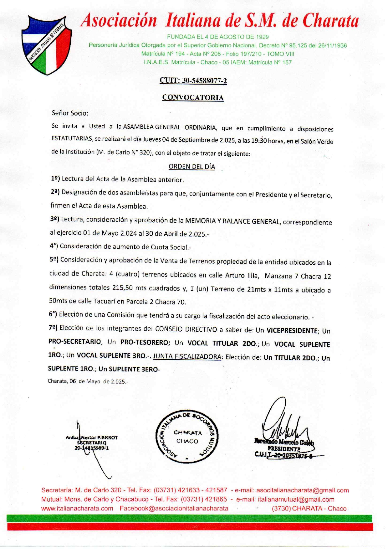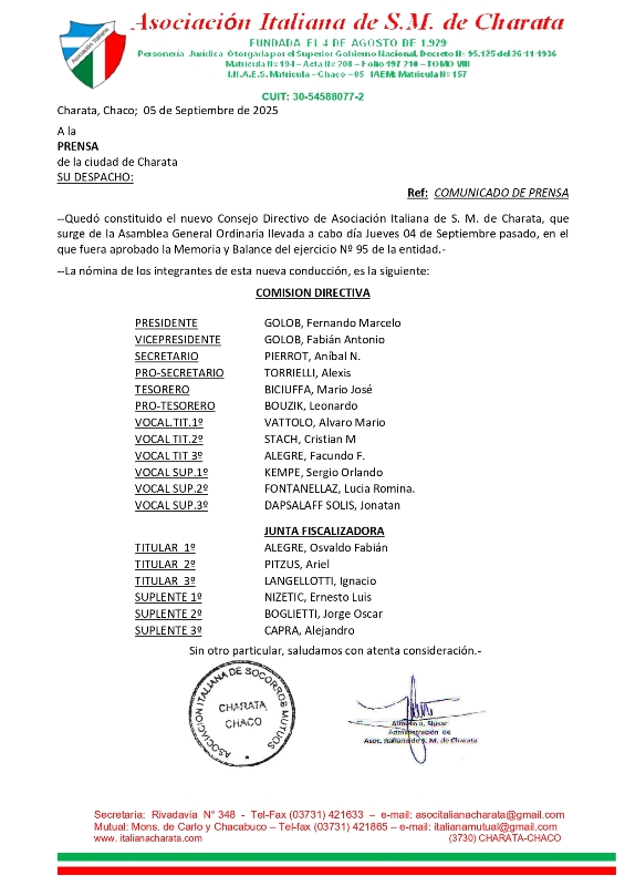 Instamos a los señores socios, directivos, personal y subcomisiones de nuestra entidad a seguir trabajando con más empeño, dedicación ad – honorem, con transparencia y con un perfil solidario, desarrollista para el crecimiento de toda nuestra Asociación Italiana de Socorros Mutuos de Charata. -