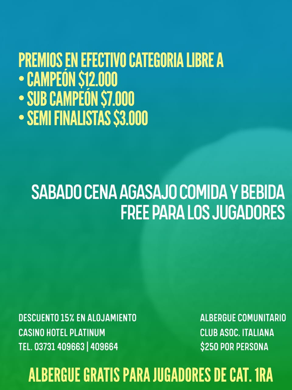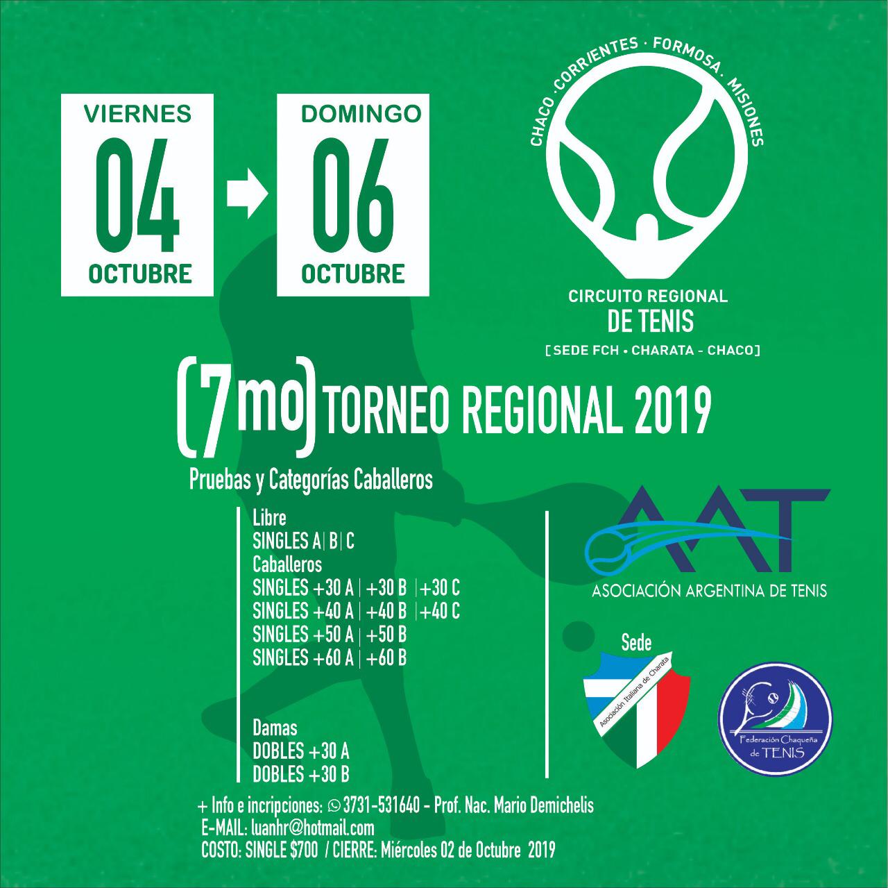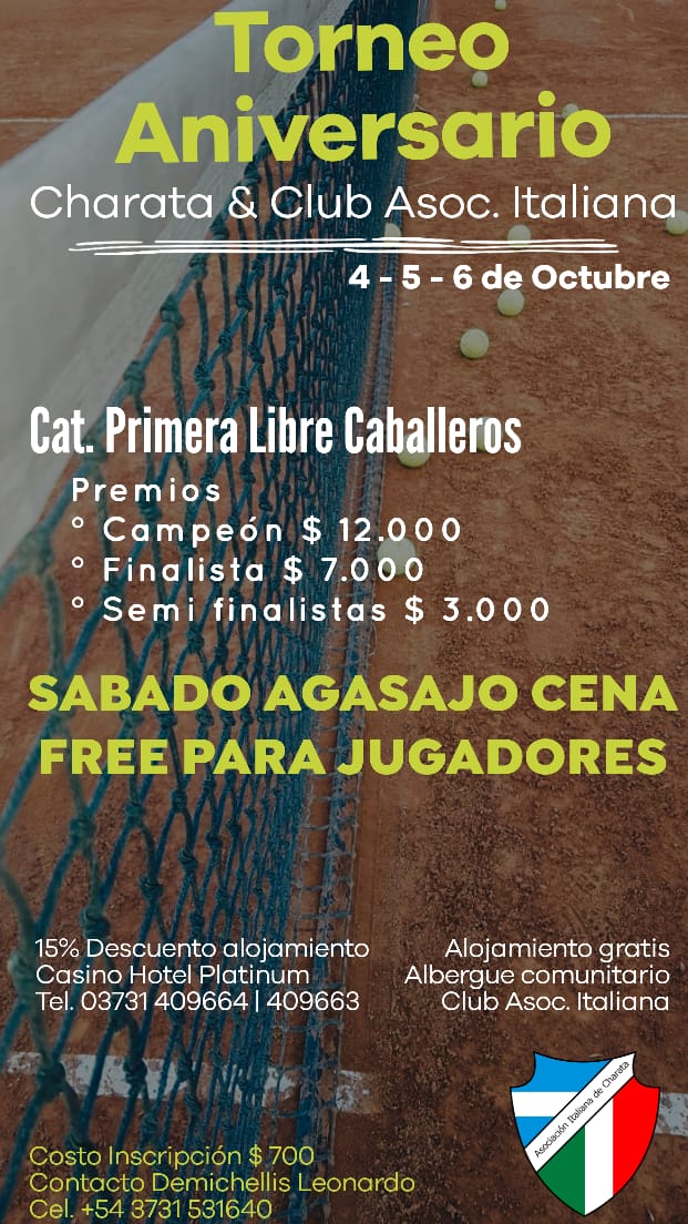Italiana organizara la séptima etapa correspondiente al circuito regional seniors de tenis los días 4, 5 y 6 de octubre en marco del  105 aniversario de la ciudad de Charata. Este es un circuito creado y conformado por las cuatro provincias de la región denominada 1ra por la ASOCIACION ARGENTINA DE TENIS (AAT). Sus 4 Federaciones Chaco, Corrientes, Formosa y Misiones conforman y avalan este circuito de tenis de Adultos denominado SENIORS. Es el torneo más importante de la región NEA. Se espera la llegada de más de 80 deportistas de alto nivel a la ciudad para competir por puntos para el ranking y la clasificación para el Máster de cada categoría. Las categorías a disputarse en las cuatro canchas de polvo de ladrillo del predio polideportivo ubicado en el Barrio Ulm serán: VARONES: Categoría LIBRE A, B Y C  - Categoría Mayores 30 A, B y C, Categoría Mayores 40 A, B y C, Categoría Mayores 50 A y B, y Categoría Mayores 60 A Y B. MUJERES : Categoría LIBRE A, B Y C.