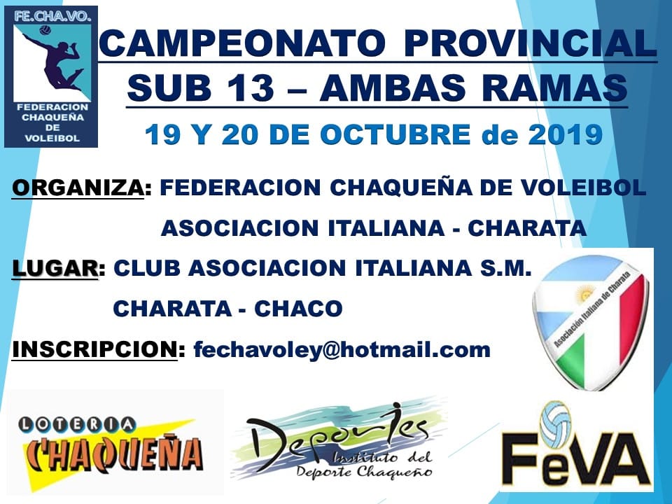 Desde la Federación Chaqueña de voley confirmaron que el Provincial en categoria SUB13 se desarrollara en Asociación Italiana los días sábado 19 y domingo 20 de Octubre en el Microestadio y Estadio Antonio Golob. Los mejores equipos de la provincia en las ramas masculinas y femeninas competiran para ver quién es el campeón y se lleva la clasificación a la Copa Argentina. Las tanitas son grandes candidatas para obtener el escalón más alto del podio. Serán 2 jornadas de gran nivel de voley. Los esperamos!!!!