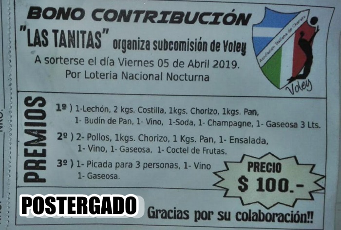 La Subcomisión de voley de Asociación Italiana de Charata comunica que el bono contribución posterga su sorteo para el próximo 12 de Abril del corriente año.