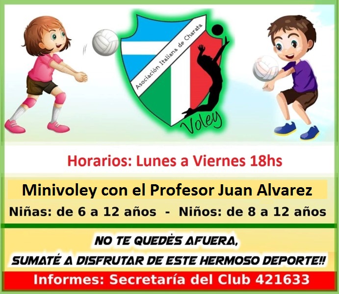 De lunes a Viernes desde las 18hs, el profe Juan Alvarez te espera para jugar, divertirse y aprender voley en las instalaciones de sede centro del club. Para nenas de 6 a 12 años y varones de 8 a 12 años. ¡¡¡Avisales a tus papis!!!. ¡¡¡Invita a tus amigas y amigos!!! ¡¡¡Te esperamos!!!