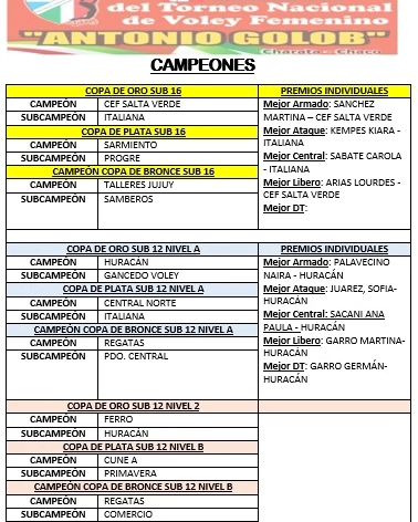En categoría sub12, Nivel A, Campeón Huracán de las Breñas ante Gancedo Voley en copra de Oro. En la copa de Plata, Italiana no pudo contra Central Norte de Resistencia. La de Bronce quedó en manos de Regatas que derroto a Pinedo Central. El club Huracán se quedo con los premios individuales de Mejores Jugadoras. Mejor Armadora: Naira Palavecino. Mejor Atacante: Sofía Juarez. Mejor Central Ana Paula Sacani. Mejor Líbero: Martina Garro. Mejor Director Técnico: Germán Garro