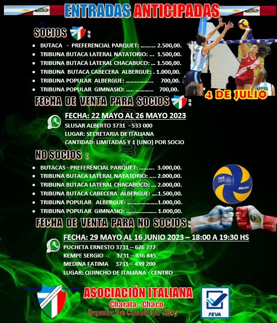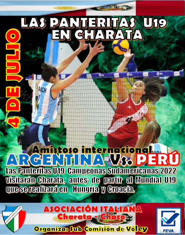 El 4 de Julio rugen las panteritas en Asociación Italiana. La Selección Argentina femenina de Vóley U19, (las panteritas), se prepara para disputar el Mundial Femenino Sub19 que se disputará en Croacia-Hungría, para ello disputará partido amistoso dónde enfrentará a su par de Perú en el Estadio Antonio Golob de Asociación Italiana de Charata. Los esperamos para vivir lo mejor del vóley en este Amistoso Internacional de gran nivel. Alentemos a las panteritas que viene de obtener de manera  el Campeonato Sudamericano 2022 de la categoría sub19 disputado en Bolivia. Venta de entradas anticipadas a socios a partir del Lunes 22 de Mayo y a No Socios a partir del Lunes 29 de Mayo en secretaría del club.
