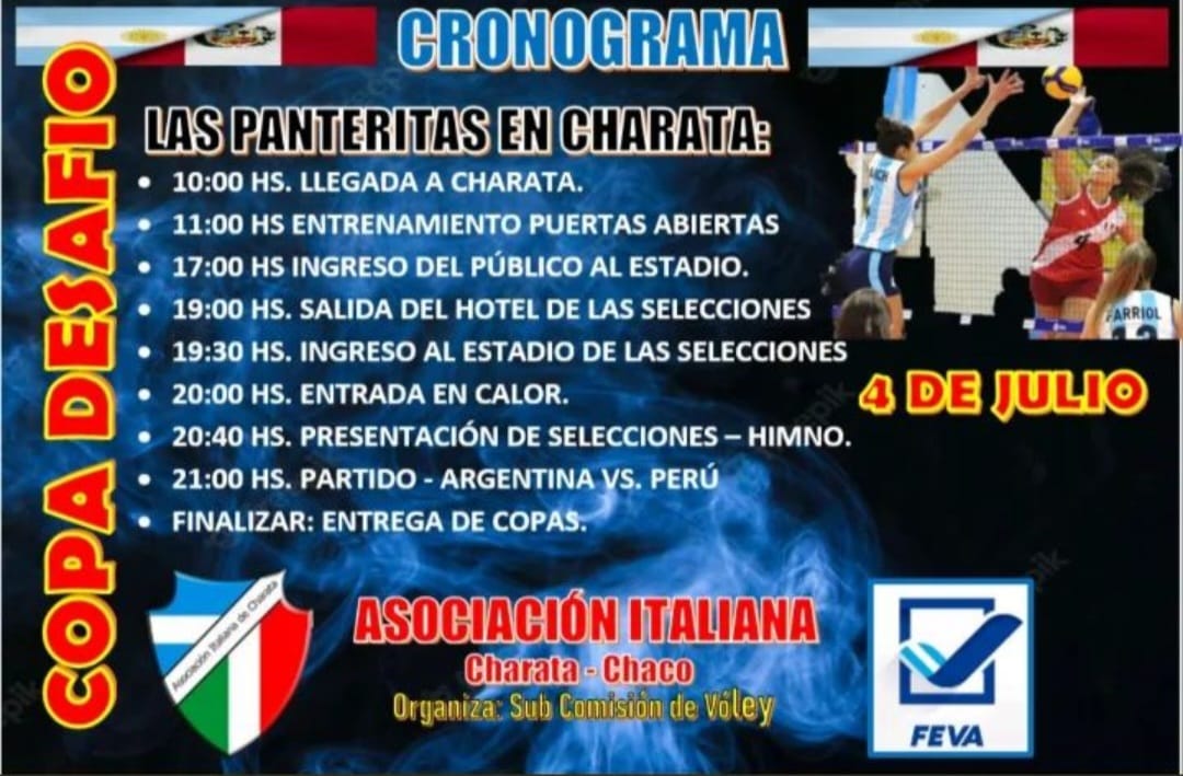 Este Martes 4 de Julio se disputa el Amistoso Internacional de Voley Femenino sub19 entre Argentina vs Perú. Se pone en juego la Copa Desafío 94 Aniversario de Asociación Italiana de Charata.