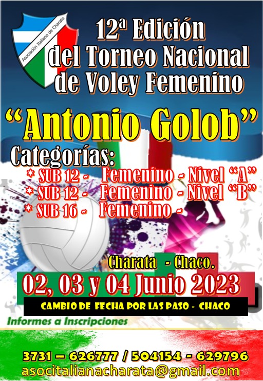Debido a que el Domingo 18 de Junio, se realizan las elecciones PASO en la provincia del Chaco, el 12° Torneo Nacional de Vóley Femenino "Antonio Golob" ha cambiado de fecha. El mismo se adelanta para poder realizarse los días 02, 03 y 04 de Junio en las instalaciones de Asociación Italiana. Consultas e Inscripciones al 3731 626777/ 504154 / 629796 o al email Esta dirección de correo electrónico está siendo protegida contra los robots de spam. Necesita tener JavaScript habilitado para poder verlo. Los esperamos.
