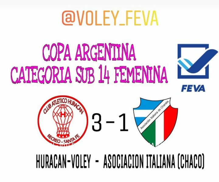 Asociación Italiana se encuentra compitiendo la Copa Argentina de Voley en la rama femenina en categoría sub14 en Chapadmalal provincia de Buenos Aires. En la 2da jornada de competencia se enfrentaron a Huracán de Recreo, donde cayeron en un partido disputado por 3 sets a 1 ( parciales de 19-25; 25 a 17; 18 a 25 y 23 a 25) correspondiente al 3er encuentro del grupo D.