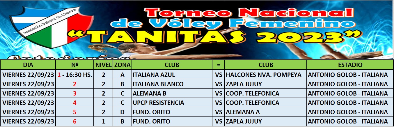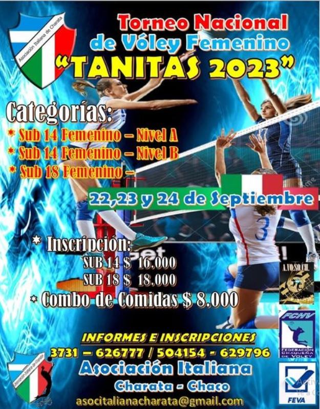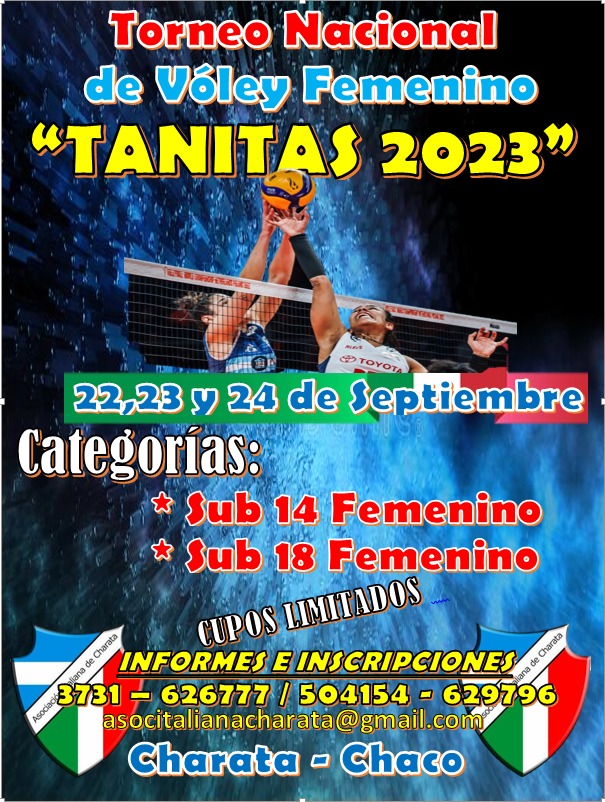 Un gran fin de semana a puro vóley se vivió en Asociación Italiana, con la participación de 30 equipo en categorías sub14 y sub18 en el torneo Tanitas 2023. En sub 18 Italiana se llevo el primer puesto derrotando a Pinedo Central en copa de Oro. Mientras que Gancedo Vóley se llevó la Copa de Plata luego de ganarle a Alvear. Premios: Individuales: Mejor Armadora: Juarez Morena- Pinedo Central. Mejor Recepción: Brisa Arguimbau (Italiana). Mejor Bloqueo: Marianela Rothger (Pinedo). Mejor Ataque: Soledad Borda (Italiana). Mejor Defensa: Ludmila Ledesma (Italiana).