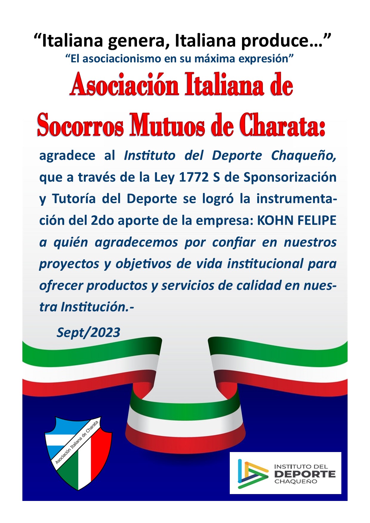 Asociación Italiana de Socorros Mutuos de Charata: agradece al Instituto del Deporte Chaqueño, que a través de la Ley 1772 S de Sponsorización y Tutoría del Deporte se logró la instrumentación del 2do aporte de la empresa: Kohn Felipe a quién agradecemos por confiar en nuestros proyectos y objetivos de vida institucional para ofrecer productos y servicios de calidad en nuestra Institución.-