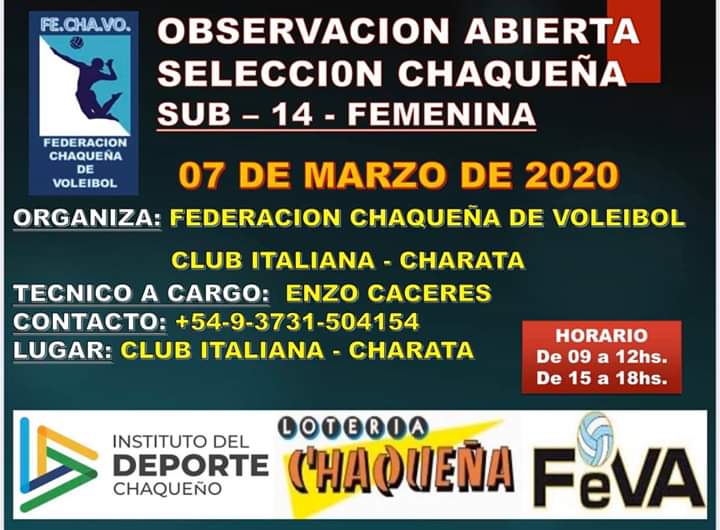 Este sábado en el Estadio Antonio Golob, se desarrollara un Campus de observación de jugadoras de Vóley en categoría SUB14 para la selección del Chaco. El mismo se llevara a cabo por la Federación Chaqueña y es dirigido por el entrenador de Asociación Italiana y de la Selección Sub 14 , Enzo Cácerez. El entrenamiento se realizara en doble turno en los horarios de 9 a 12hs y de 15 a 18hs. Las esperamos!!