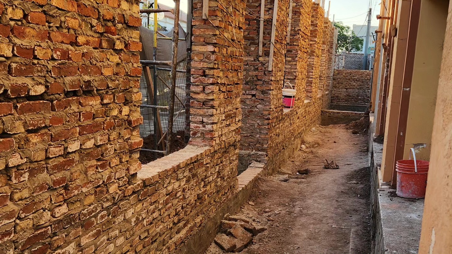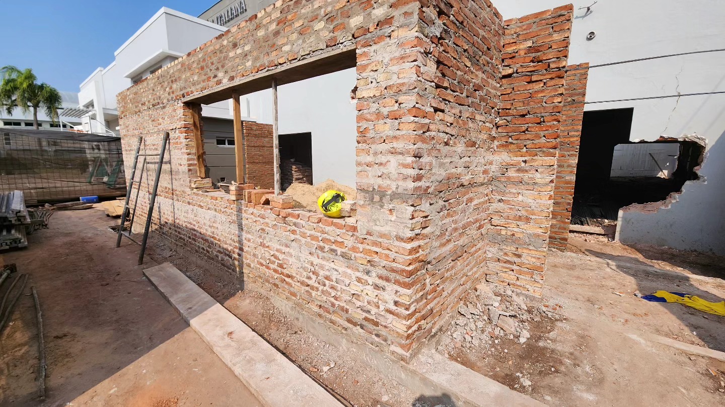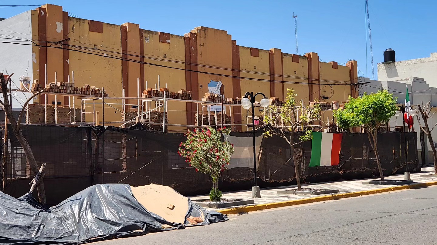 Derrumbe del muro perimetral y las paredes enfrente del Salón. Se avanzó hacia adelante sobre calle Rivadavia con el objetivo de recuperar los 2.25mts de ancho por 50 metros de largo cedidos en la vereda, haciendo un total de 112.50mts2.