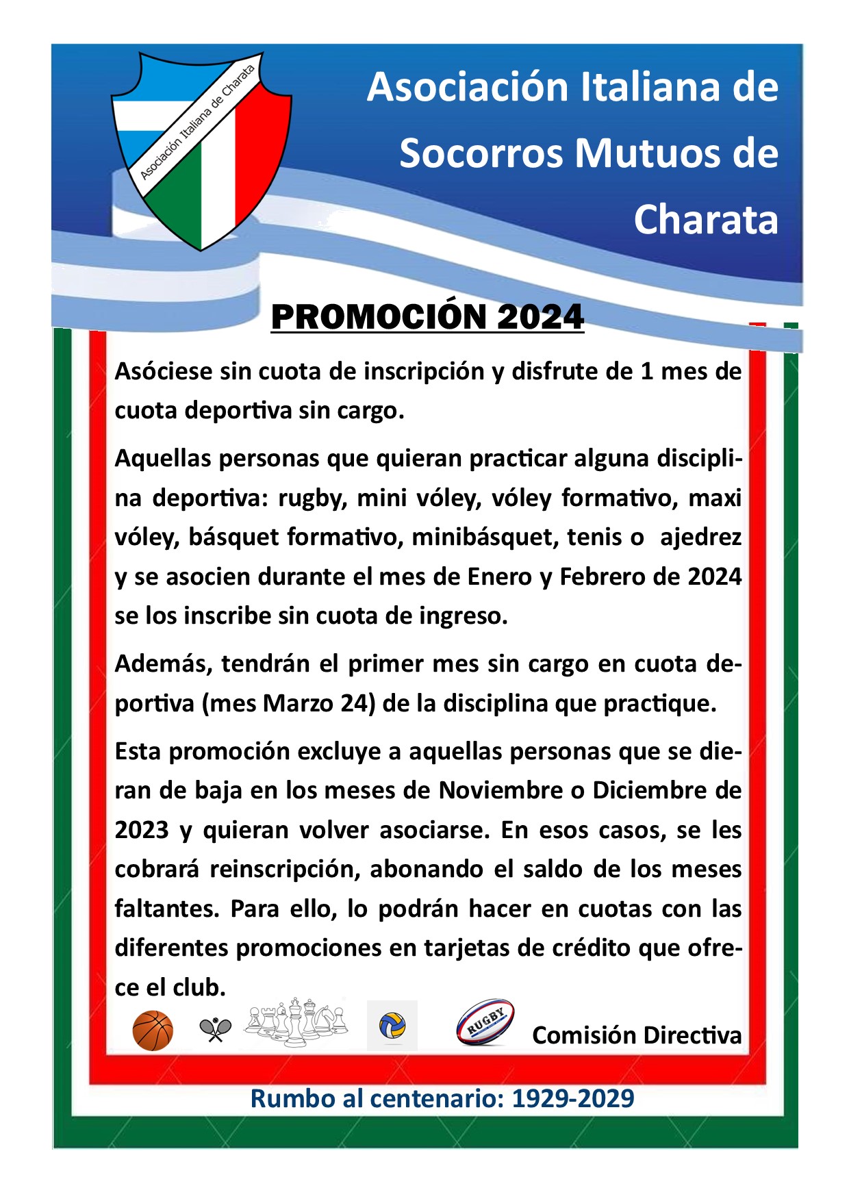 Aquellas personas que quieran practicar alguna disciplina deportiva: rugby, mini vóley, vóley formativo, maxi vóley, básquet formativo, minibásquet, tenis o  ajedrez y se asocien durante el mes de Enero y Febrero de 2024 se los inscribe sin cuota de ingreso. Además, tendrán el primer mes sin cargo en cuota deportiva (mes Marzo 24) de la disciplina que practique.