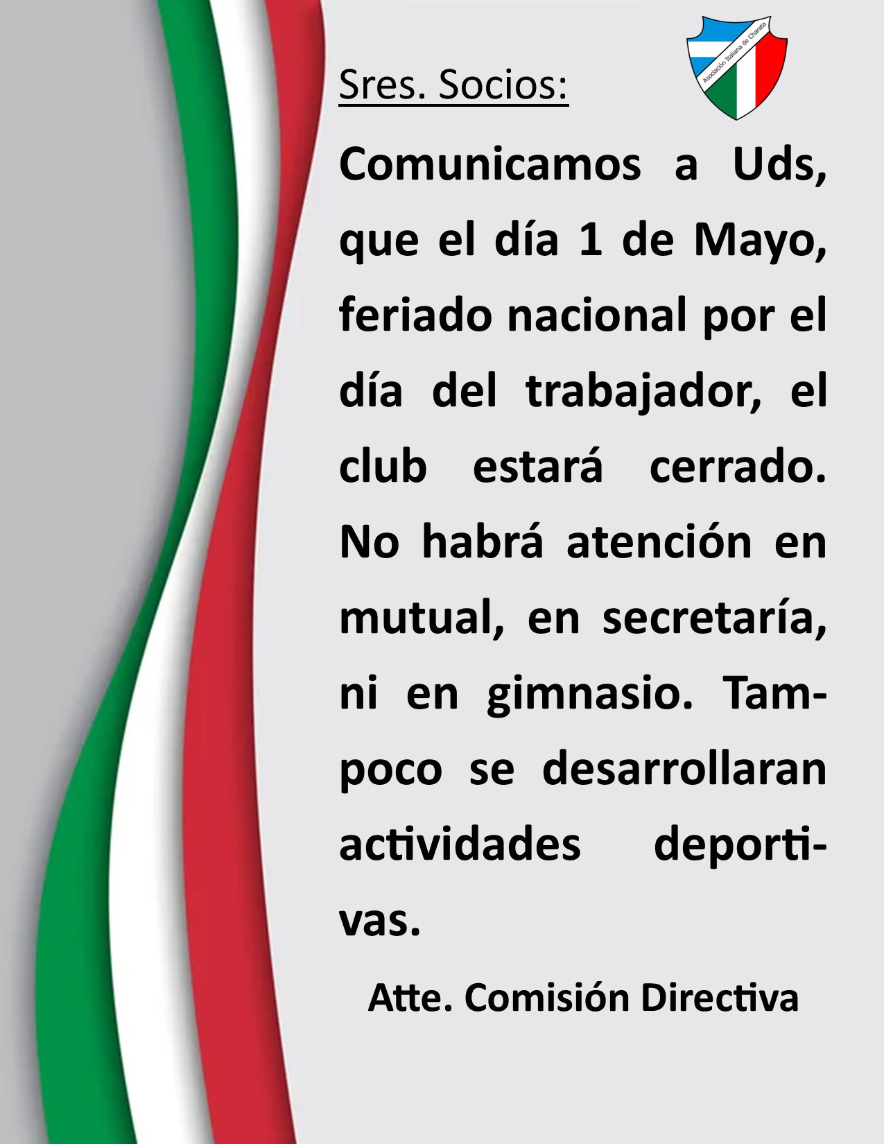 Instamos a los señores socios, directivos, personal y subcomisiones de nuestra entidad a seguir trabajando con más empeño, dedicación ad – honorem, con transparencia y con un perfil solidario, desarrollista para el crecimiento de toda nuestra Asociación Italiana de Socorros Mutuos de Charata. -