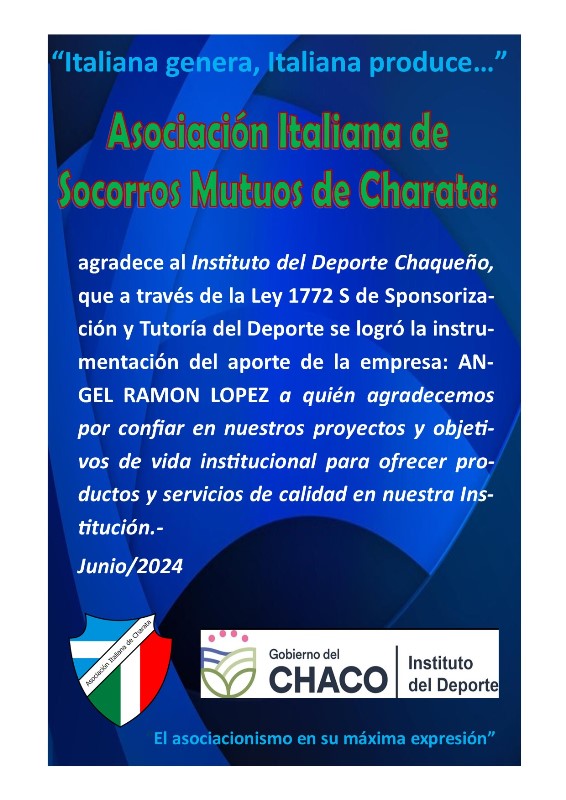 Agradecemos al Instituto del Deporte Chaqueño, que a través de la Ley 1772 S de Sponsorización y Tutoría del Deporte se logró la instrumentación del aporte de la empresa: ANGEL RAMON LOPEZ a quién también agradecemos por confiar en nuestros proyectos y objetivos de vida institucional para ofrecer productos y servicios de calidad en nuestra Institución.