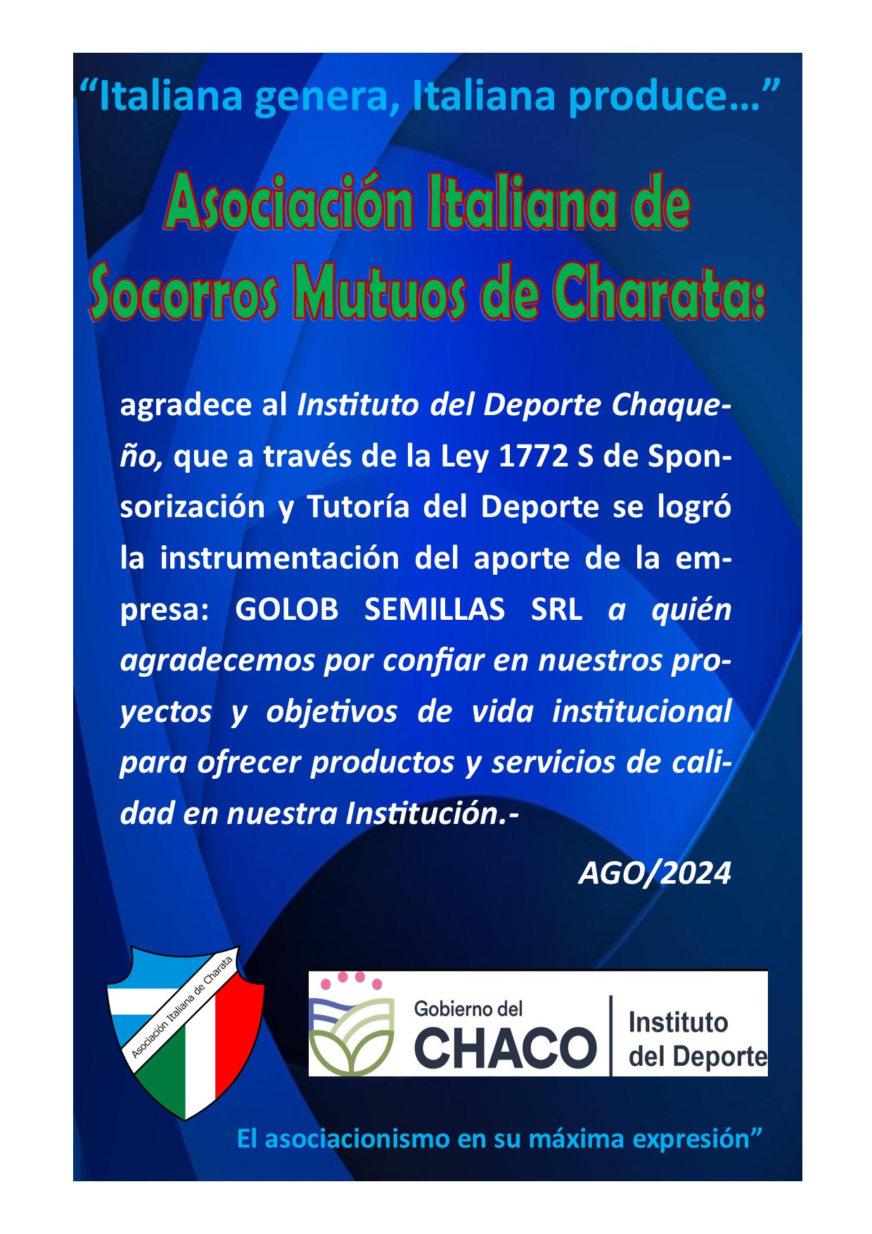 Agradecemos al Instituto del Deporte Chaqueño, que a través de la Ley 1772 S de Sponsorización y Tutoría del Deporte se logró la instrumentación del aporte de la empresa: GOLOB SEMILLAS SRL a quién agradecemos por confiar en nuestros proyectos y objetivos de vida institucional para ofrecer productos y servicios de calidad en nuestra Institución.-